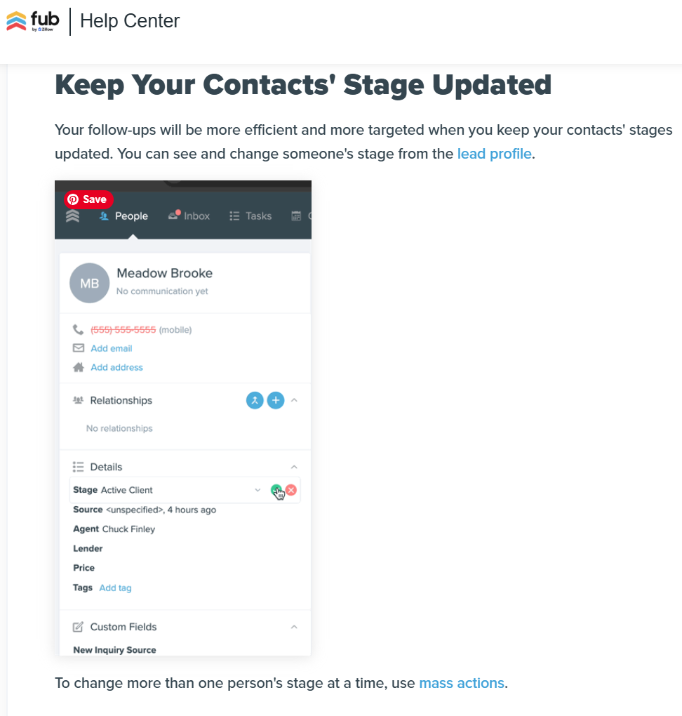 For a complete section in the FUB Help Center on contacts: Changing a Lead Stage
