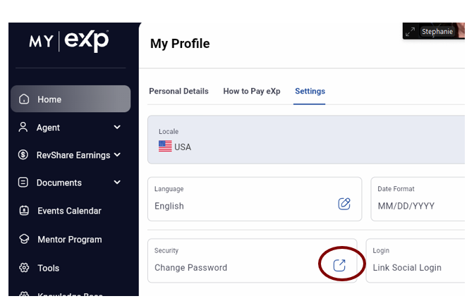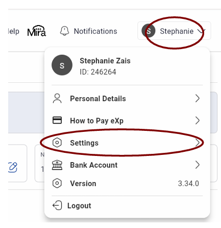 3. Once logged in to your eXp account, click your name in the upper right corner, then choose “Settings”.