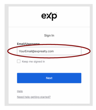 - Use your browser and go to the My eXp page at https://my.eXpRealty.com/login. Enter your email address and click “Next”.