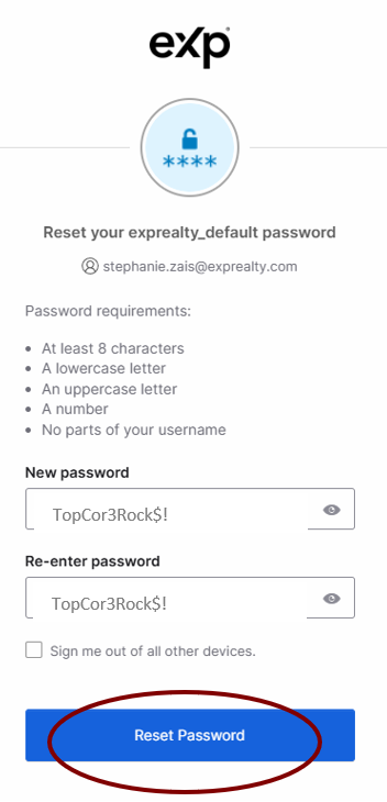 8. FINALLY – put the temporary password into both sections and click “Reset Password”. The temporary password is TopCor3Rock$!