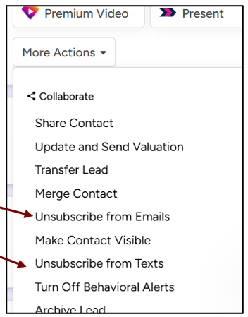 2. More Actions: To change your contact’s subscription options via the “More Actions” route, search for the contact, then click on the contact’s name to bring up their profile page. On the right side of their profile, click the “More Actions” dropdown.