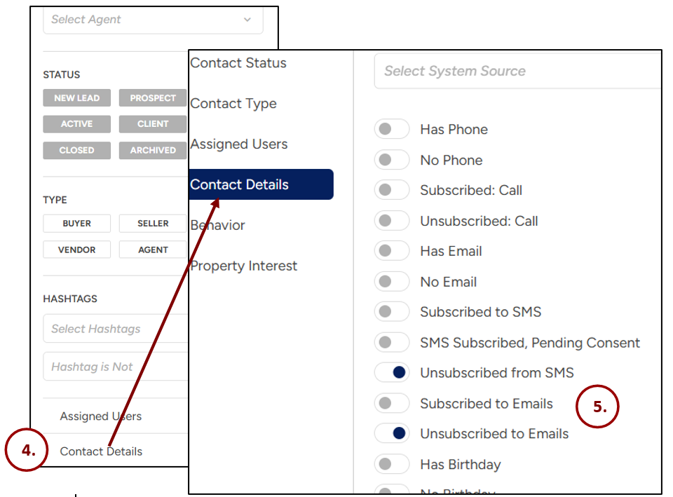 Contacts can unsubscribe from marketing emails by clicking an unsubscribe link. This typically affects email campaigns and mass emails. These rely on compliant communication. When a contact unsubscribes or opts out, respect their choice immediately to stay compliant with regulations (CAN-SPAM, TCPA, etc.) Therefore, campaigns will be sent only to contacts who have not unsubscribed from any of your communication methods, such as email or text. To find out whether a contact has unsubscribed from emails or texts, follow the steps below.